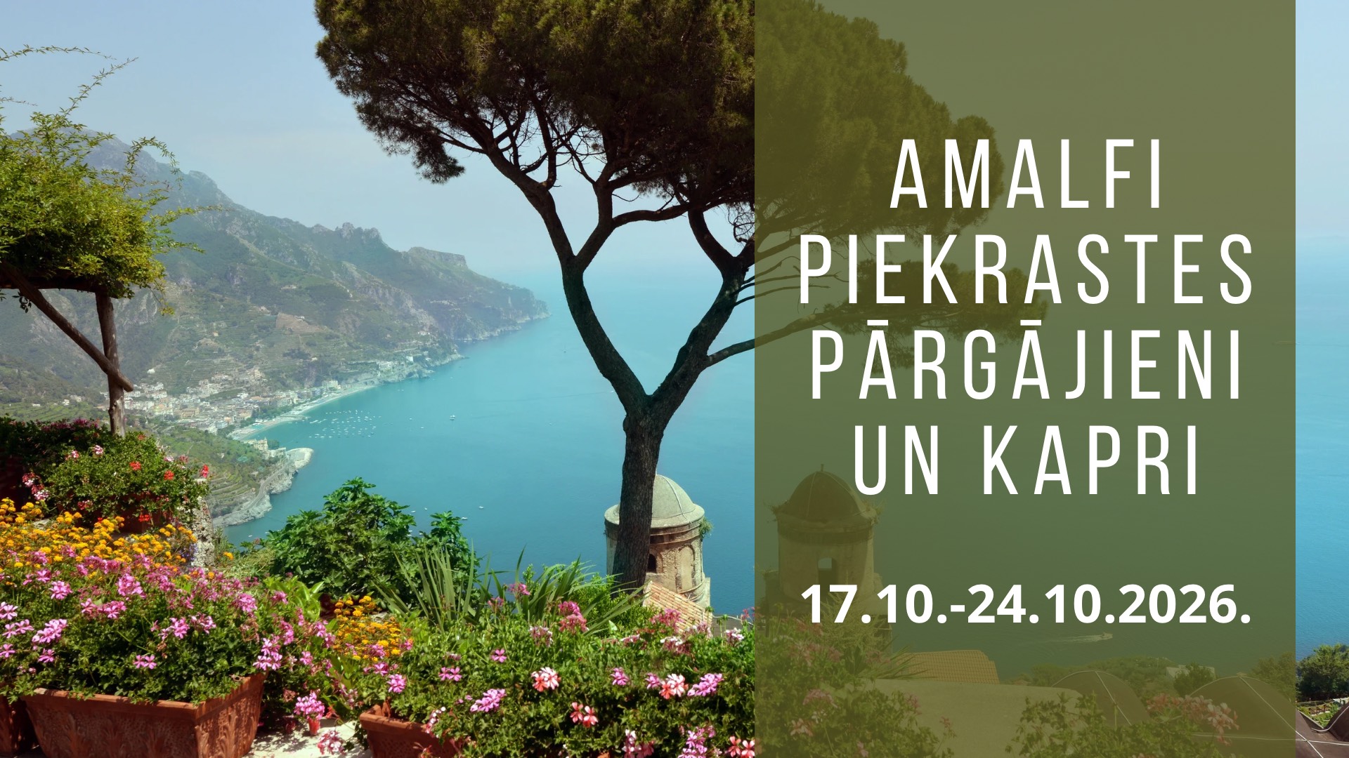 Sešu dienu pārgājiens pa Dienviditālijas takām slavenajā Amafi piekrastē ved cauri šarmantiem itāļu ciematiņiem ar skaistiem skatiem uz tirkīzzilo piekrasti.Pārgājiens sāksies Sorento, par ko jūsmojis gan Gēte, Stendāls un Dikenss, gan Nīče, Mendelsons, Kazanova un daudzi citi. Dosimies pārgajienā pa Dievu taku ar panorāmas skatiem pāri Amalfi krastiem un to noslēgsim ar peldi Positāno ciema pasakainajā pludmalītē, nokāpjot no kalniem.