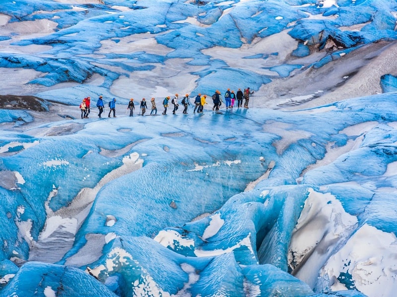 Ledāja piedzīvojums. Brauciens uz Sólheimajökull un dosimies ledāja pārgājienā ar dzelkšņiem un ledus cirtni (kopā ar vietējo gidu). Gatavojies izpētīt īstu ledāju šajā iesācējiem draudzīgajā pārgājienā. Tu soļosi pāri mirdzošam ledum, ielūkosies plaisās un redzēsi apburošas ledus formas pavisam tuvu. Sertificēts ledāju gids izskaidros, kā ledāji pārvietojas, mainās un veido zemi zem tiem – pārvēršot katru soli jaunā atklājumā! Ledāja izpēte aizņems aptuveni 4 stundas, tāpēc paspēsim vēl arī apskatīt slavenos ūdenskritumus – Skógafoss, kur ir iespēja uzkāpt pa trepēm un redzēt to no augšas, un Seljalandsfoss, kuram var apriet no otras puses, bet jārēķinās, ja ir slikts laiks, tad pieeja ūdenskritumam nav iespējama. Un netālu no tā ūdenskrituma var aiziet uz citu ūdenskritum, kas atrodas alā. Izbaudīsim dzīvi, nopeldoties nekurienes karsto avotu baseiniņā, kur ūdens ir silts vienmēr un apkārt kolosāla ainava. Nakšņosim viesu mājā netālu no Vík pludmales, lai no rīta ērti varētu doties apskatīt tās melnās vulkāniskās smiltis, majestātiskās bazalta kolonnas un iespaidīgos viļņus.