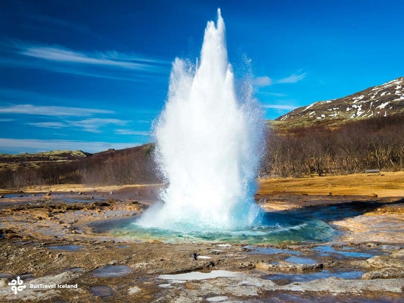 Zelta loks. Dosimies uz aktīvā geizera apskati, kas atrodas Geysir ģeotermālajā rajonā, kura nosaukums radies no Lielā Geysira – dabas brīnuma, kas savu vārdu aizdevis visiem pasaules geizeriem. Strokkur ir iespaidīgākais aktīvais geizers šajā teritorijā, jo pats Geysir šobrīd atrodas neaktīvā periodā. Strokkur izvirst daudz regulārāk, nekā to jebkad darīja Geysir – ik pēc piecām līdz desmit minūtēm debesīs paceļot ūdens strūklas līdz pat 15–20 metru augstumam. Tas ir patiesi iespaidīgs skats! Apskatīsim Blesi karsto avotu, kas ir viens no galvenajiem geotermālajiem objektiem Geysira rajonā, un Gullfuss ūdenskritumu, kas veido daudzpakāpju kaskādi. Noslēgumā iziesim 5 km pārgājienā pa aizas taku, kur varēs redzēt, kā Eirāzijas un Ziemeļamerikas tektoniskās plātnes pakāpeniski attālinās viena no otras. Pastaigājoties pa taku, apskatīsim dziļās šķirbas, dramatiskās klintis un arī skaistu ūdenskritumu, kas papildina šo iespaidīgo ainavu.