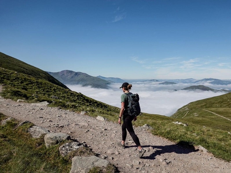 Ar nakts vilcienu (04:50) dosimies uz Fort Wiliamsu, noliksim lielās somas un kāpsim Ben Nevis – augstākajā kalnā Lielbritānijā (1345 metri virs jūras līmeņa). Laikapstākļi virsotnē ir mānīgi – iespējama migla, lietus vai pat sniegs arī vasarā. Kopējais pārgājiens uz augšu un lejā aizņems apmēram 9 h, tādēļ pusdienosim pa ceļam (17km; 1325 augstummetri; 1325 augstummetri uz leju). Sākotnējais kāpums pa labi izveidotu taku līdz ezeram, pēc tam taka kļūs stāvāka un sākas zig zag posms līdz virsotnei. Lejup dosimies pa to pašu taku.